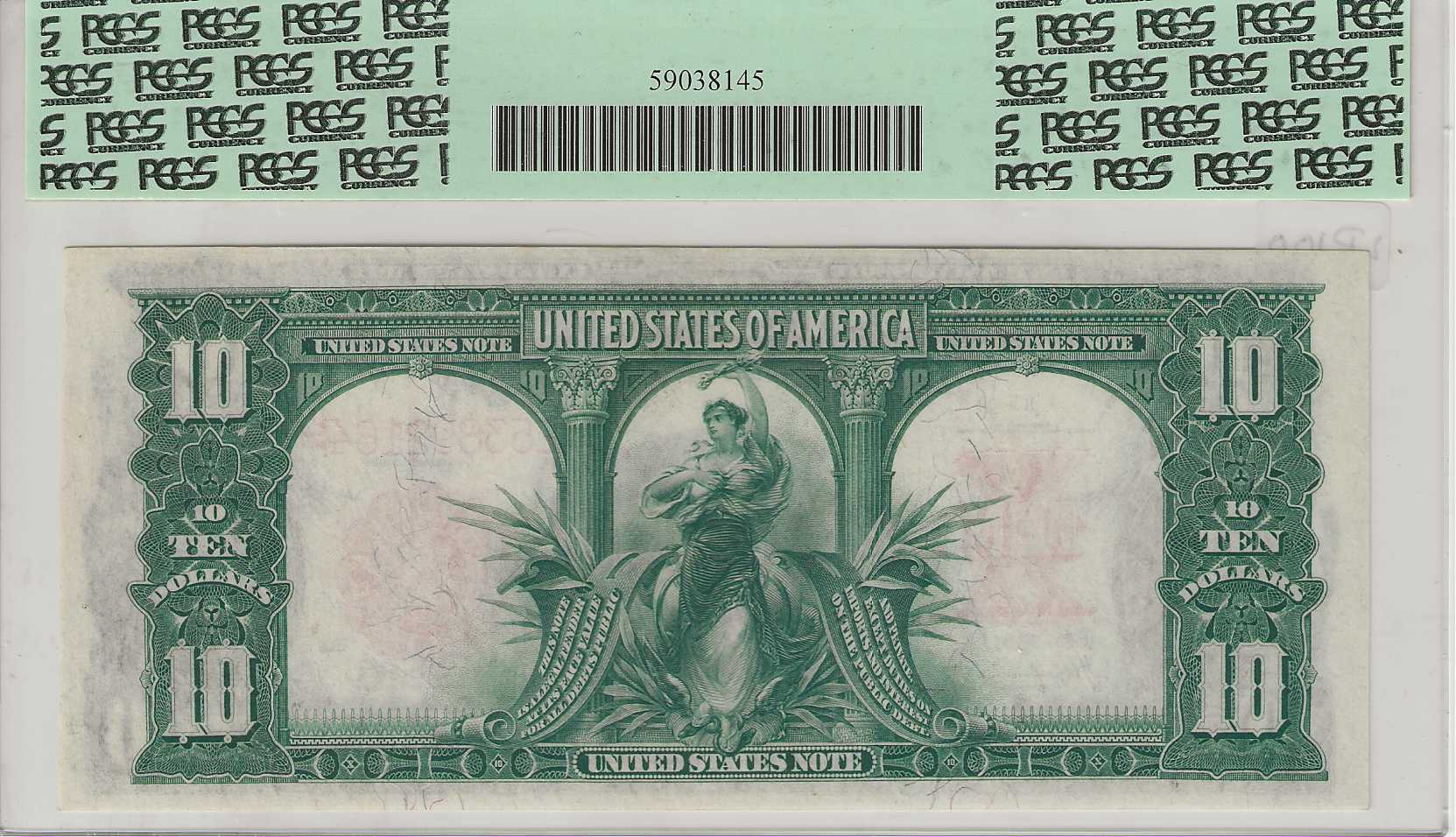 The $10 1901 Legal Tender Note, famously known as the “Bison Note,” is a standout piece of American currency celebrated for its artistic and historical significance. This note is in pristine condition, exhibiting vibrant colors, crisp paper, and perfectly centered margins. The PPQ designation ensures its exceptional preservation and originality, making it a gem for collectors. The front of the note prominently features a majestic American Bison at the center, symbolizing the strength and resilience of the United States. On either side of the bison are detailed portraits of explorers Lewis and Clark, honoring their pioneering spirit and contributions to American history. The design is further accented by a bold red Treasury Seal and serial numbers, surrounded by intricate black engravings. The reverse boasts an elegant green pattern of geometric designs and scrollwork, adding both beauty and security. This note epitomizes the craftsmanship and symbolism of early 20th-century U.S. currency.
