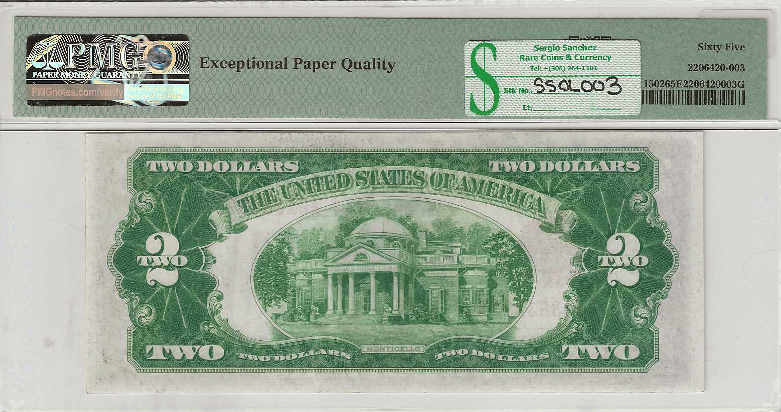 A beautiful example of a 1928A $2 Legal Tender Note, cataloged as Fr. 1502 and certified PMG 65 EPQ Gem Uncirculated. The coveted Exceptional Paper Quality designation confirms the note’s originality, brightness, and untouched paper surfaces—hallmarks of a true Gem that has retained its integrity since issue. This early‑series deuce displays crisp, vibrant paper and the strong eye appeal expected at the Gem level. The face features the finely engraved bust of Thomas Jefferson, rendered with sharp detail and framed by balanced margins and clean, well‑preserved surfaces. The reverse showcases the classic View of Monticello, presented with clarity and depth that highlight the artistry of this iconic design. A standout selection for collectors seeking a high‑grade, beautifully preserved 1928A Legal Tender $2 with unquestionable originality, premium visual appeal, and the assurance of PMG‑verified EPQ quality.
