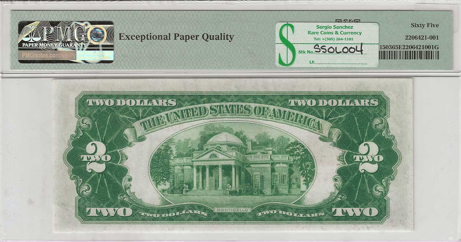 A beautiful example of a 1928B $2 Legal Tender Note, cataloged as Fr. 1503 and certified PMG 65 EPQ Gem Uncirculated. The coveted Exceptional Paper Quality designation confirms the note’s originality, brightness, and untouched paper surfaces—hallmarks of a true Gem that has retained its integrity since issue. This early‑series deuce displays crisp, vibrant paper and the strong eye appeal expected at the Gem level. The face features the finely engraved bust of Thomas Jefferson, rendered with sharp detail and framed by balanced margins and clean, well‑preserved surfaces. The reverse showcases the classic View of Monticello, presented with clarity and depth that highlight the artistry of this iconic design. A standout selection for collectors seeking a high‑grade, beautifully preserved 1928B Legal Tender $2 with unquestionable originality, premium visual appeal, and the assurance of PMG‑verified EPQ quality.