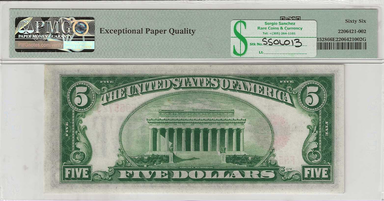 A Gem Uncirculated example of the 1928C $5 Legal Tender Note, cataloged as Fr. 1528, offering everything you expect to see in a true GEM. The face presents the finely engraved bust of Abraham Lincoln, complemented by a bold red seal and matching red serial numbers that stand out vividly against the bright, original paper and generous margins. The reverse features the iconic View of the Lincoln Memorial, sharply rendered with the depth and clarity that define high‑end early‑series Legal Tender notes. Certified PMG 66 EPQ, this note carries the coveted Exceptional Paper Quality designation—confirmation of its originality, brightness, and untouched paper surfaces. A premium example for collectors seeking a beautifully preserved, high‑grade 1928C $5 with unquestionable integrity and exceptional eye appeal.
