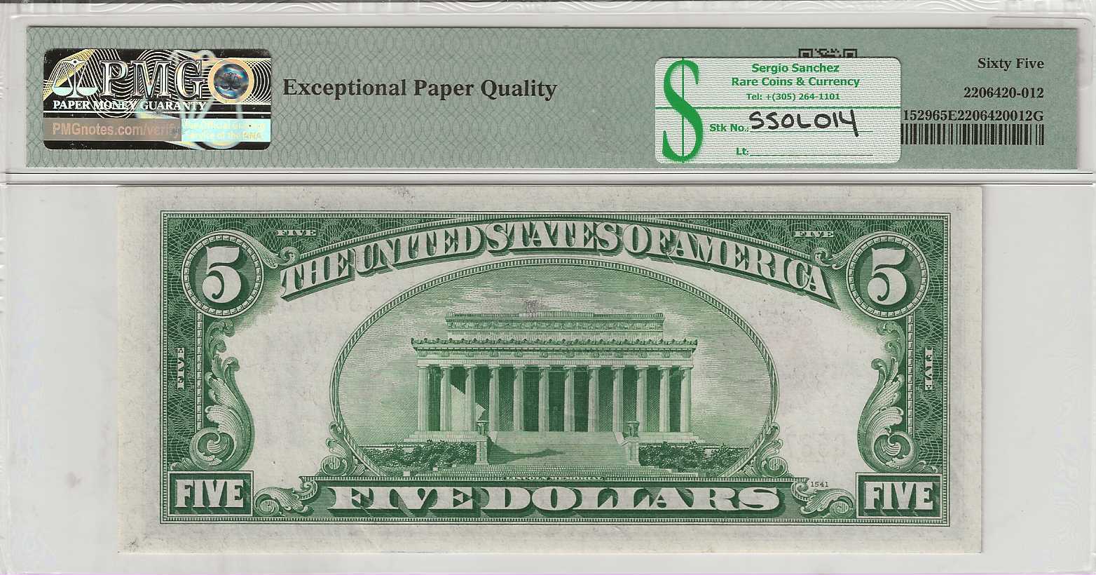 A Gem Uncirculated example of the 1928D $5 Legal Tender Note, cataloged as Fr. 1529, offering everything you expect to see in a true GEM. The face presents the finely engraved bust of Abraham Lincoln, complemented by a bold red seal and matching red serial numbers that stand out vividly against the bright, original paper and generous margins. The reverse features the iconic View of the Lincoln Memorial, sharply rendered with the depth and clarity that define high‑end early‑series Legal Tender notes. Certified PMG 65 EPQ, this note carries the coveted Exceptional Paper Quality designation—confirmation of its originality, brightness, and untouched paper surfaces. A premium example for collectors seeking a beautifully preserved, high‑grade 1928D $5 with unquestionable integrity and exceptional eye appeal.