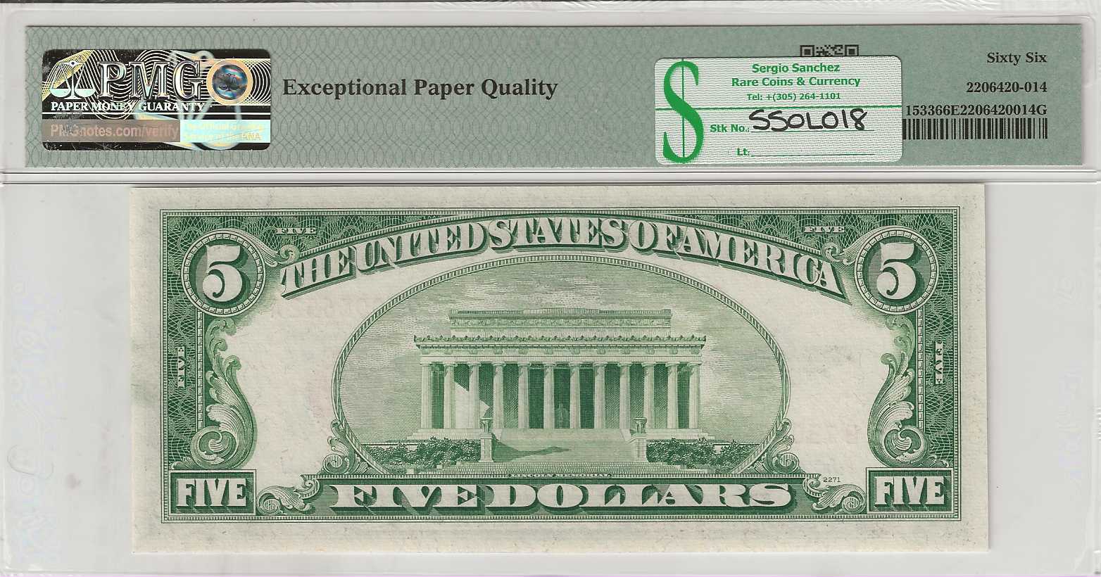 A Gem Uncirculated example of the 1953A $5 Legal Tender Note, cataloged as Fr. 1533, offering everything you expect to see in a true GEM. The face presents the finely engraved bust of Abraham Lincoln, complemented by a bright small red seal and matching red serial numbers that stand out vividly against the crisp, original paper and generous margins. The reverse features the iconic View of the Lincoln Memorial, sharply rendered with the depth and clarity that define high‑end mid‑century Legal Tender notes. Certified PMG 66 EPQ, this note carries the coveted Exceptional Paper Quality designation—confirmation of its originality, brightness, and untouched paper surfaces. A premium example for collectors seeking a beautifully preserved, high‑grade 1953A $5 with unquestionable integrity and exceptional eye appeal.