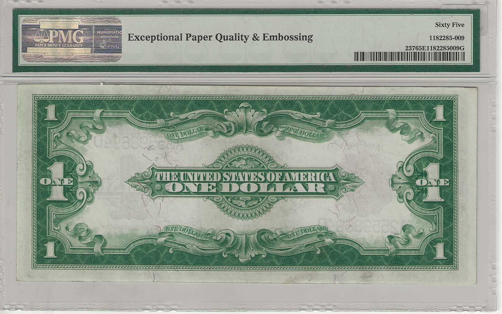 This $1 1923 Speelman/White Silver Certificate offers strong visual appeal for its assigned grade, with bold color and well-proportioned margins that enhance its presentation. PMG has recognized its originality and preservation with the coveted “Exceptional Paper Quality” designation—an assurance of quality that sets this note apart.