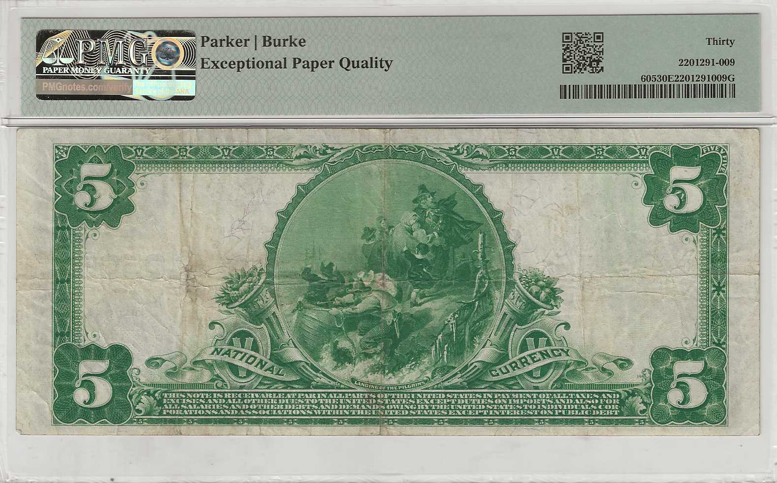 This Very Fine Fr. 605 from Lewistown, Pennsylvania (CH# 10506) is an especially attractive example, combining historical importance with strong visual appeal. The obverse features a distinguished bust of President Benjamin Harrison, while the reverse showcases the finely engraved and iconic “Landing of the Pilgrims” vignette. With its originality, balanced eye appeal, and crisp preservation for the grade, this note has been further distinguished by PMG with its Exceptional Paper Quality designation. A premium offering for the discerning collector.