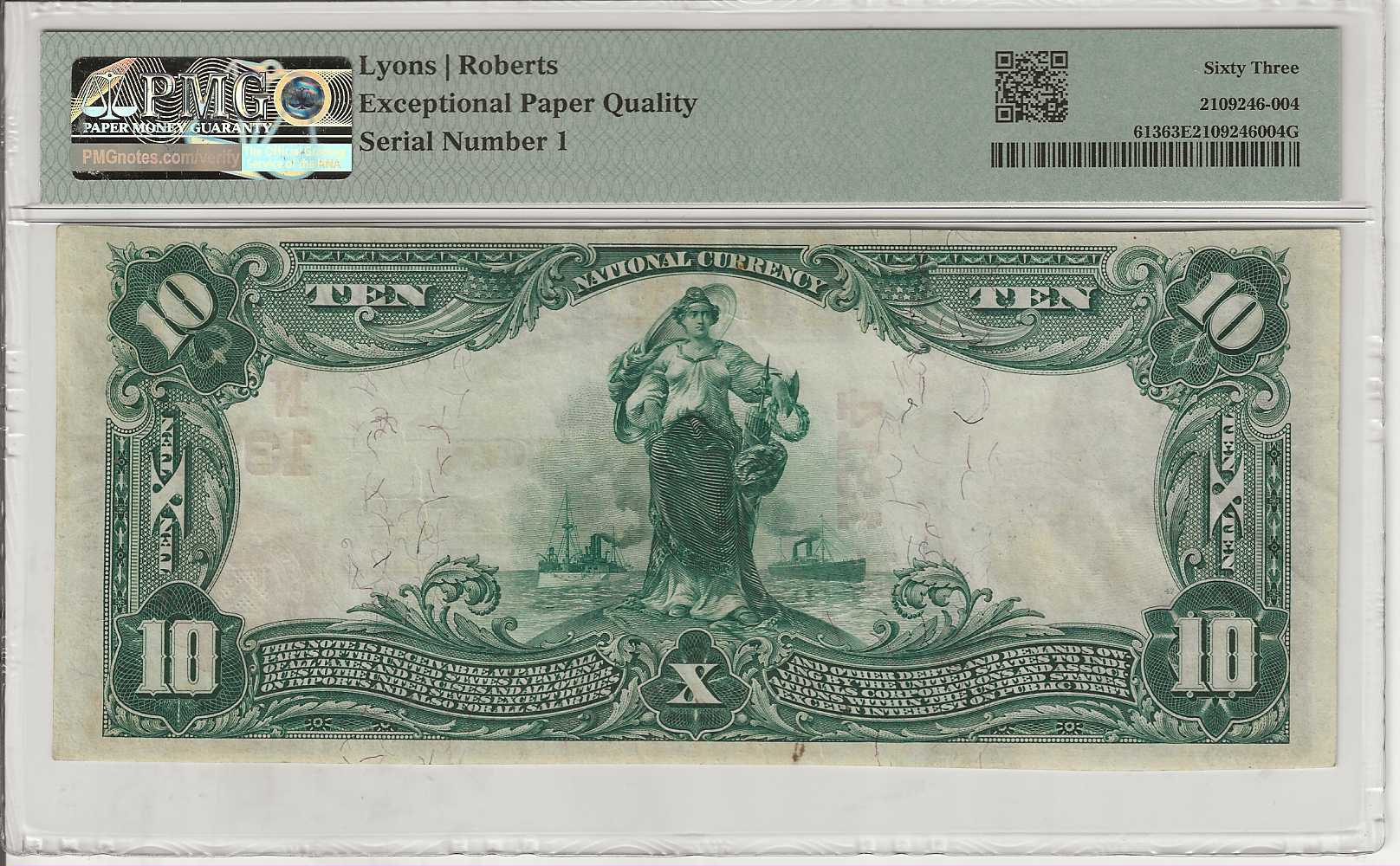 This exceptional FR 613 has been graded Choice Uncirculated and proudly bears PMG’s Exceptional Paper Quality designation—and it shows in every detail. The face features a distinguished bust of President William McKinley, the 25th President of the United States (1897–1901), whose life was tragically cut short following the Pan‑American Exposition in Buffalo. The reverse presents the elegant and symbolic Liberty and Progress vignette. Adding to its already remarkable appeal, this note carries the coveted Serial Number 1—a distinction that elevates it into a league of its own. A piece of this caliber offers both rarity and prestige—a trophy note any collector would be proud to call their own.