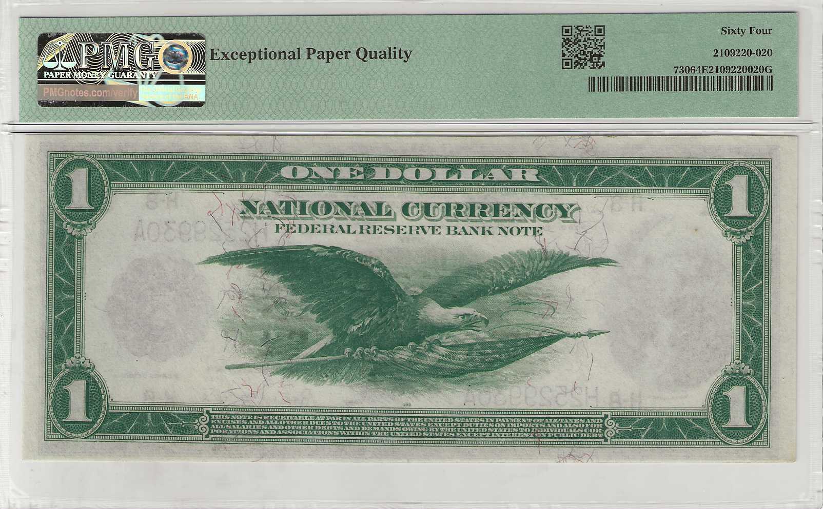 A pristine and distinctive specimen of this $1.00 St. Louis Federal Reserve Bank Note, boasting vivid coloration and pronounced embossing. It’s no surprise that PMG has honored this remarkable note with the “Exceptional Paper Quality” designation. Truly, this is a beautiful piece that would be a treasured addition to any collector’s portfolio.