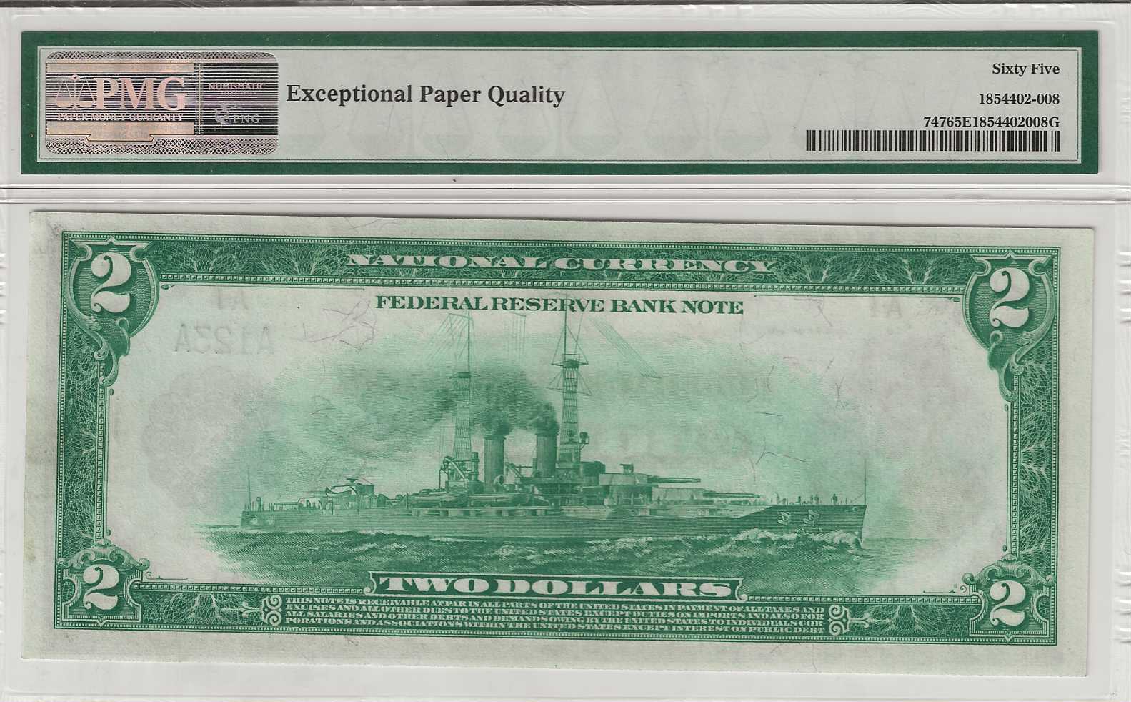 The 1918 $2 Federal Reserve Bank Note from Boston, certified Gem Uncirculated PMG 65 EPQ, is a distinguished example of American currency. The obverse features a portrait of Thomas Jefferson, symbolizing the nation’s democratic ideals, alongside the Boston district’s official blue seal and matching serial number. Of particular note is its sequential serial number A123A, adding further distinction and desirability. The reverse presents a finely detailed vignette of American warships, capturing a pivotal moment in U.S. history. With its artistry, originality, and exceptional preservation, this note stands as a premium acquisition for the advanced collector.