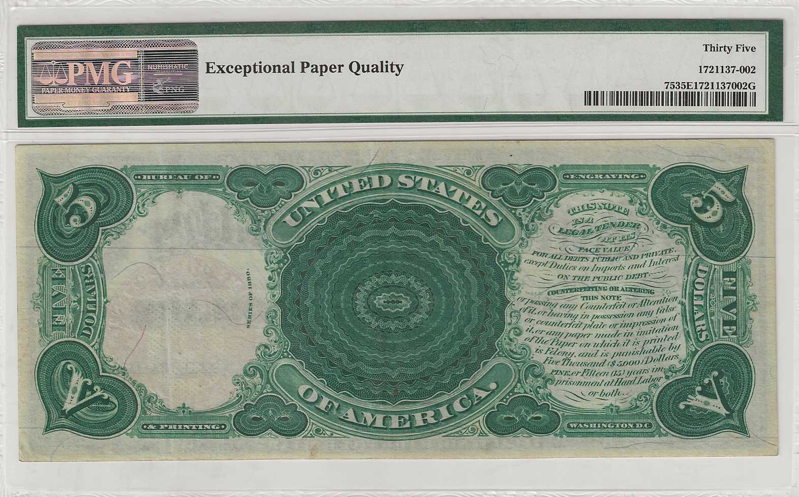 FR. 75 – 1880 $5 Legal Tender PMG 35 EPQ CVF