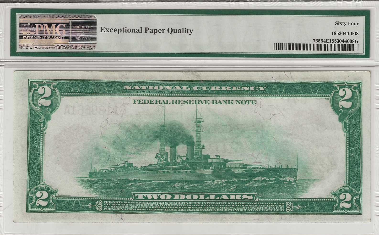 The face of this Battleship Note features a classic vignette of Thomas Jefferson, the third President of the United States—continuing the tradition that began with his first appearance on the Federal $2 bill in the Series of 1869 Legal Tender. This example offers all the eye appeal expected of a true Choice Uncirculated note, with bold detail and strong visual presence. The Exceptional Paper Quality designation is fully deserved, as the note’s originality is immediately evident in its fresh paper surfaces and well‑preserved texture.