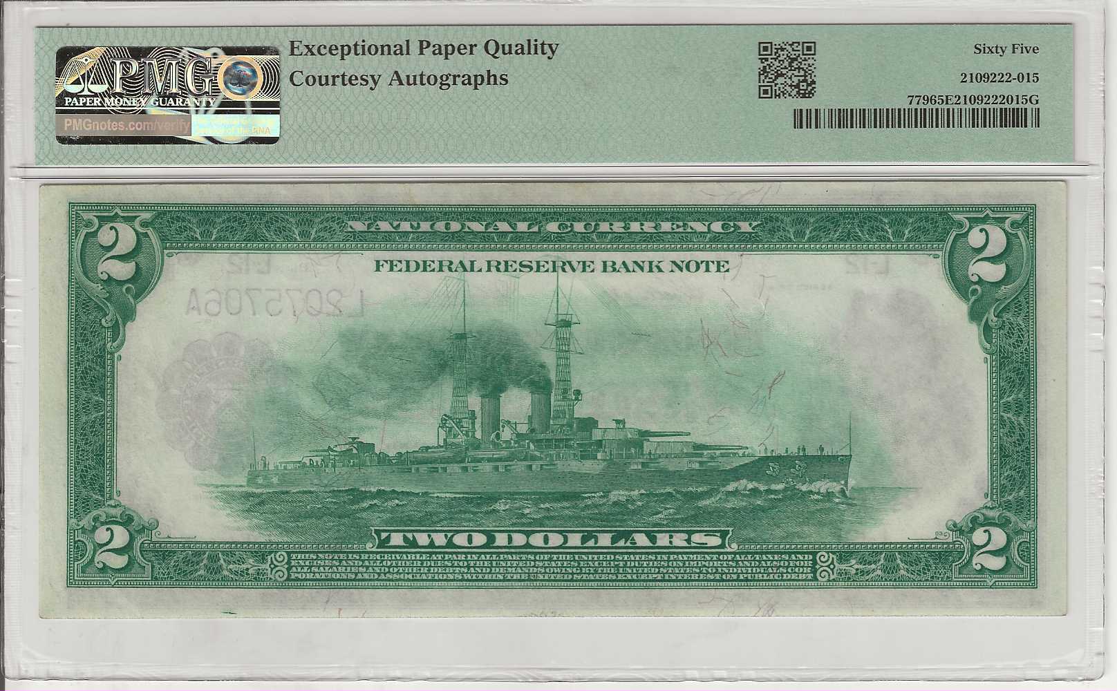 This $2 San Francisco Federal Reserve Bank Note features the signatures of Elliott-Burke and Clerk-Calkins. Track & Price reports that there are 66 known examples under this Friedberg number, with a limited number graded as gem Uncirculated. This note has received PMG’s “Exceptional Paper Quality” designation and would be a great addition to any collection.