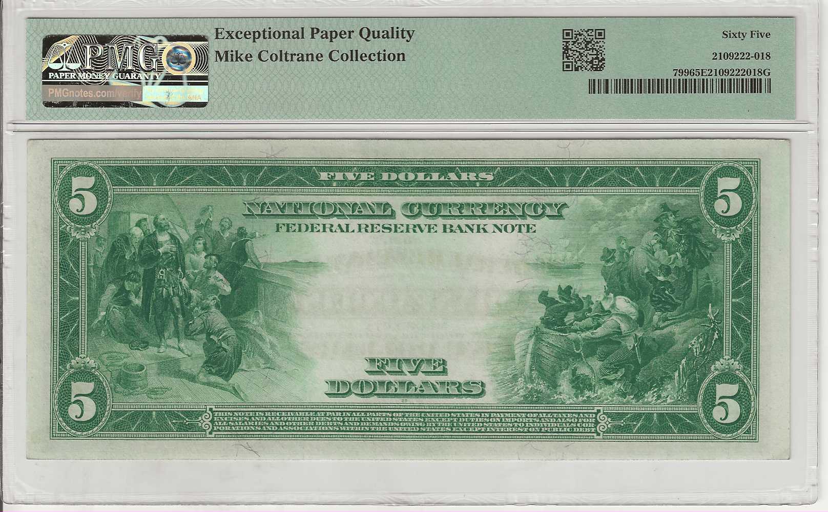 A striking example from the popular Minneapolis district, this $5 Federal Reserve Bank Note showcases the bust of Abraham Lincoln on the front. The reverse features two iconic scenes: Columbus sighting land on the left and the Pilgrims landing on the right. Graded with PMG’s “Exceptional Paper Quality” designation, this beautiful gem is a standout piece sure to be admired by collectors of all levels.