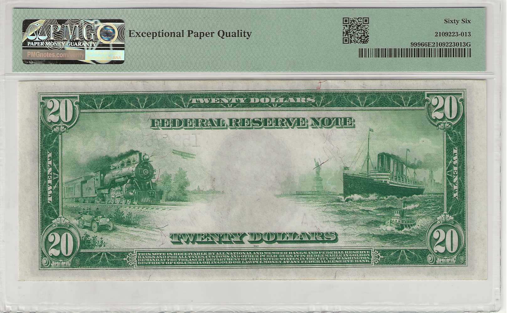 High-grade Federal Reserve Notes from the Minneapolis district are consistently in demand, yet rarely encountered. This stunning Gem Uncirculated example has been awarded PMG’s “Exceptional Paper Quality” designation, attesting to its superior preservation. The front showcases the bust of Grover Cleveland, while the reverse features vignettes representing transportation by land, air, and sea. A remarkable note that would enhance any collection.